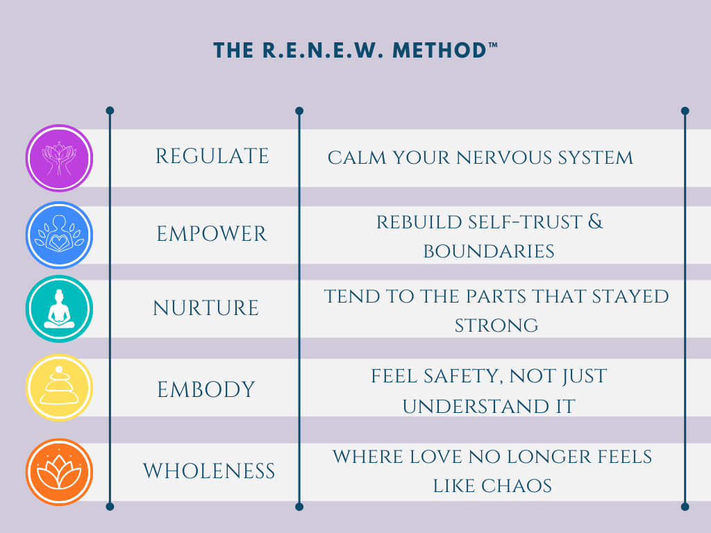 A 3-month trauma-informed coaching experience for high-functioning women who are ready to calm emotional chaos, rebuild self-trust, and feel safe in love again.